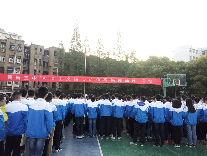 5月9日清晨,襄陽三中開展了“社會主義核心價值觀”集體誦讀活動。本次活動由高二年級副主任喬磊主持,活動目的是通過集體誦讀的形式提高學(xué)生對社會主義核心價值觀的重視和認(rèn)識,也是我校創(chuàng)建全國文明城市、爭創(chuàng)市級文明學(xué)校的活動之一。在喬磊老師領(lǐng)讀之下,同學(xué)們高聲誦讀“社會主義核心價值觀”和志愿者服務(wù)的精神。誦讀結(jié)束后,學(xué)生代表發(fā)表講話。教導(dǎo)處副主任梁智杰為本月以來表現(xiàn)優(yōu)異的學(xué)生頒發(fā)獎品。