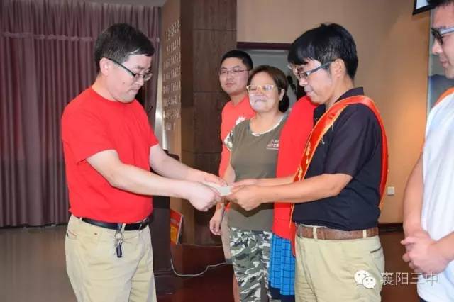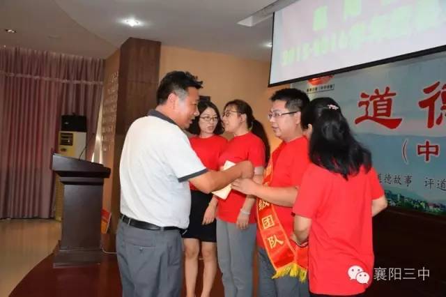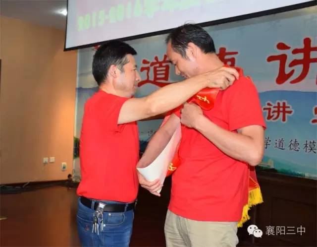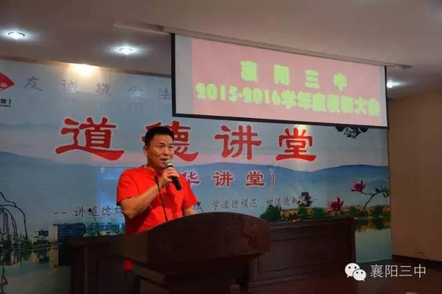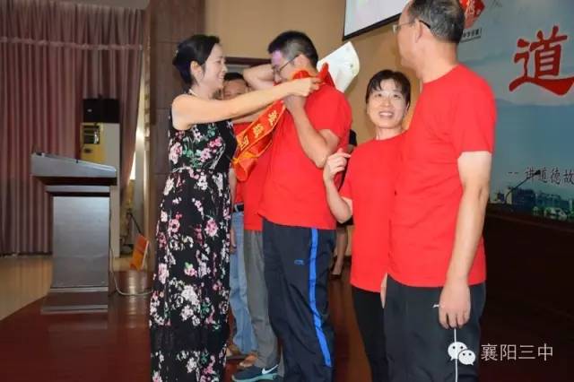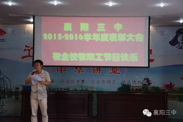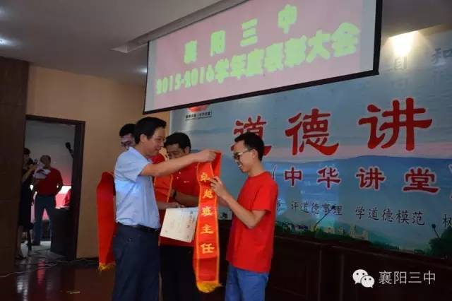 之后,舉行了盛大的頒獎(jiǎng)儀式。伴隨著激昂的《頒獎(jiǎng)進(jìn)行曲》,學(xué)校領(lǐng)導(dǎo)給先進(jìn)團(tuán)隊(duì)和個(gè)人佩戴綬帶,頒發(fā)獲獎(jiǎng)證書,和他們合影留戀。原高三(13)班班主任鄧永峰老師代表功勛班主任作了典型發(fā)言,介紹了班級管理經(jīng)驗(yàn)。鄧?yán)蠋熥詈筮€念了一段教師節(jié)當(dāng)天學(xué)生給他寫的節(jié)日祝福,標(biāo)題是《我都不想說你》,歷數(shù)了鄧?yán)蠋熞恍臑榱藢W(xué)生、卻從不注意照顧好自己及家庭的種種事例,這些事例是三中老師敬業(yè)奉獻(xiàn)的真實(shí)寫照。原高三化學(xué)教研組組長郭廖麗老師代表優(yōu)秀學(xué)科團(tuán)隊(duì)作了典型發(fā)言,介紹了化學(xué)教研組群策群力,搞好集體備課,提高高三化學(xué)學(xué)科整體成績的經(jīng)驗(yàn)。新高三級部主任劉常洪和陳顯宏上臺(tái)表了決心,這是對明年高考的美好憧憬。