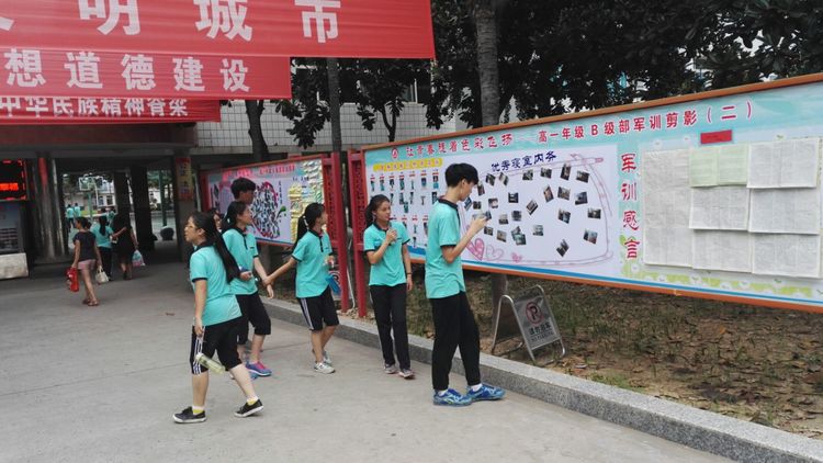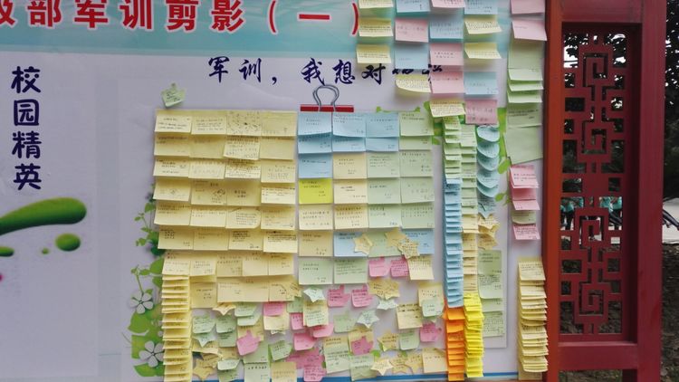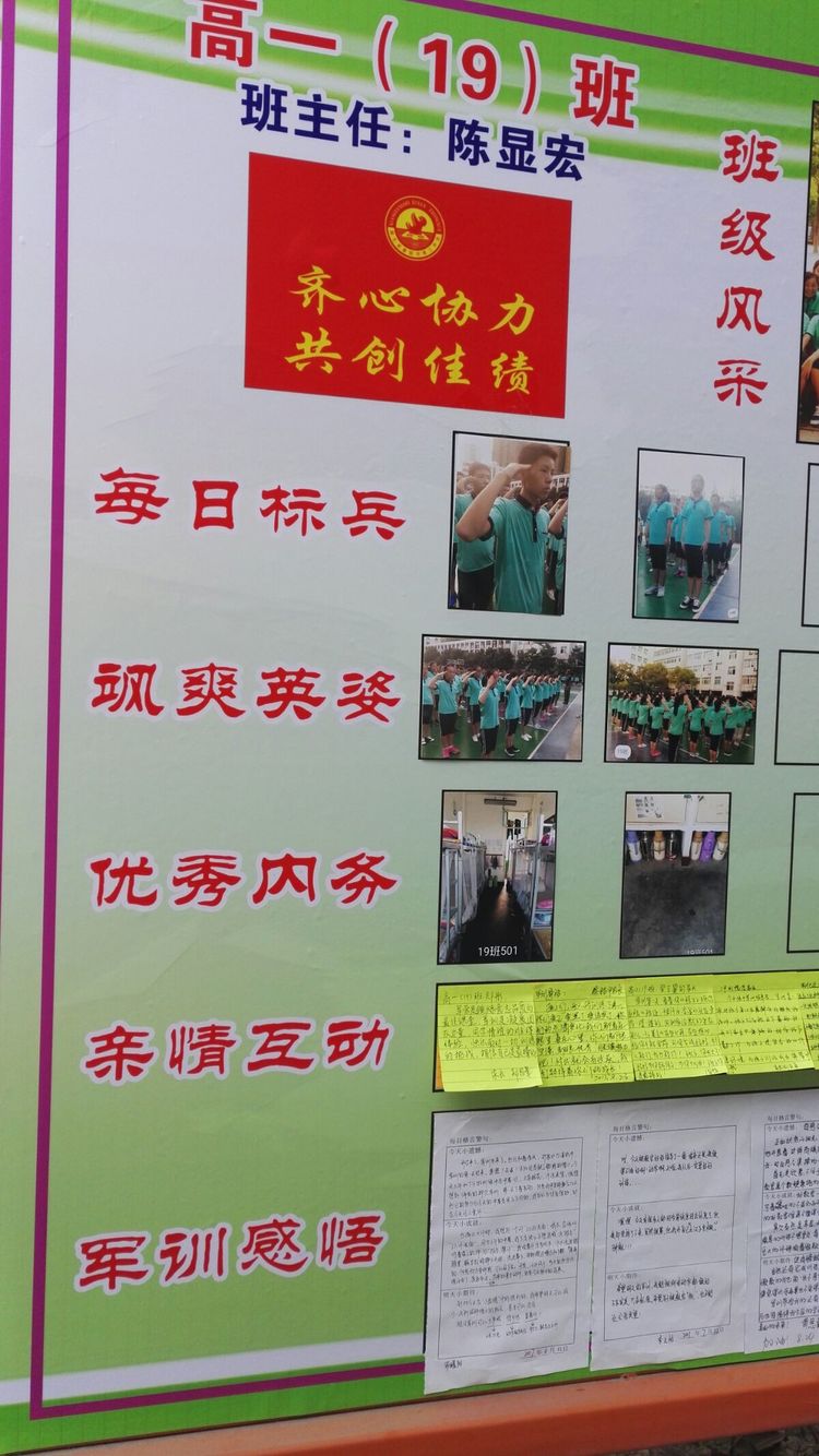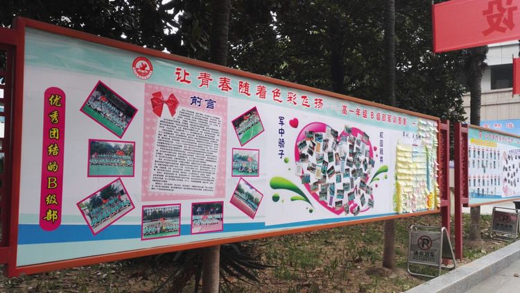 嚴(yán)明的紀(jì)律,離不開(kāi)濃濃的溫情。級(jí)部的軍訓(xùn)展板成為校園里一道靚麗的風(fēng)景線。