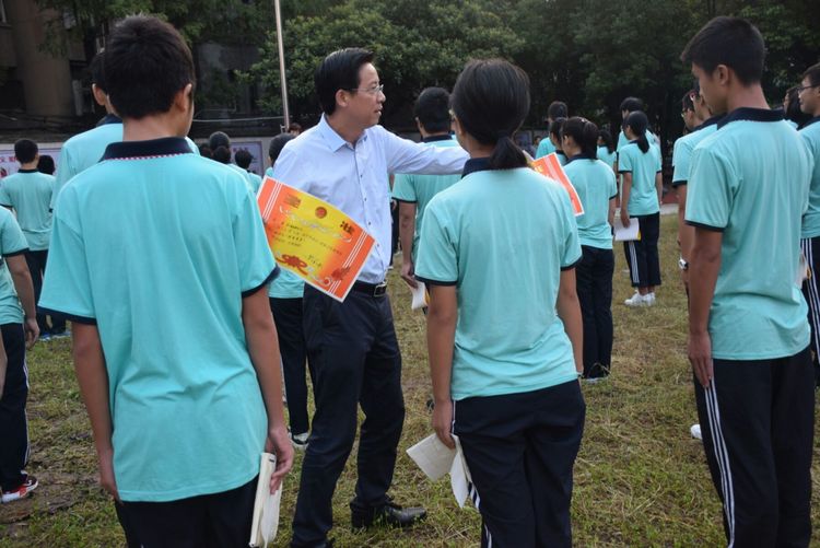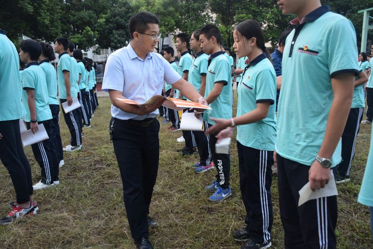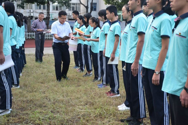 李校長(zhǎng)代表學(xué)校,給高一軍訓(xùn)中的優(yōu)秀班級(jí)和學(xué)員們頒獎(jiǎng)。