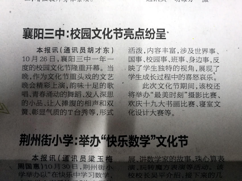 本報(bào)訊(通訊員胡才東)10月26日,襄陽(yáng)三中一年一度的校園文化節(jié)隆重開(kāi)幕。當(dāng)晚,作為文化節(jié)重頭戲的文藝晚會(huì)精彩上演,韻味十足的歌唱、青春涌動(dòng)的舞蹈、發(fā)人深思的小品、讓人捧腹的相聲和雙簧、彰顯氣質(zhì)的T臺(tái)秀等,形式活潑,內(nèi)容豐富,涉及世界事、國(guó)事、校園事、班事、身邊事,反映了學(xué)生獨(dú)特的視角,展現(xiàn)了學(xué)生成長(zhǎng)過(guò)程中的喜怒哀樂(lè)。
