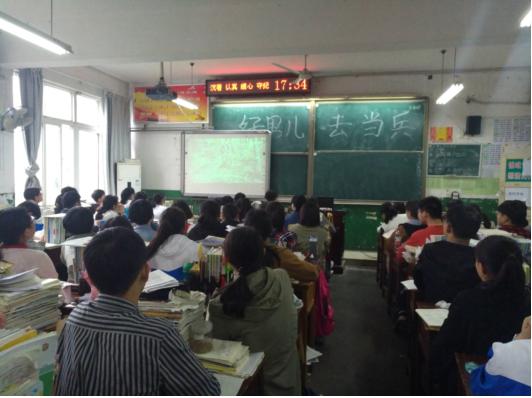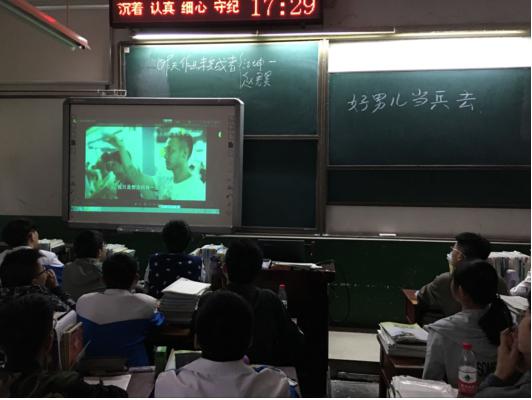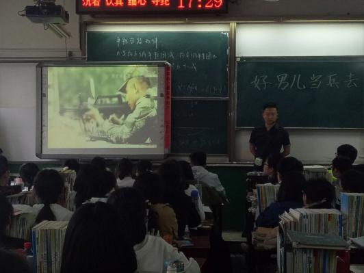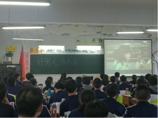 2018年5月6日下午,根據(jù)《襄陽市2018年度征兵工作實施方案》的要求,我校開展了以“好男兒,當(dāng)兵去”為主題的班會,組織學(xué)生觀看"湖北省征兵宣傳視頻",激發(fā)青年學(xué)生獻身國防的熱情。