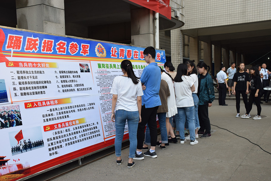 為加強(qiáng)愛國主義和國防教育,落實《襄陽市2018年度征兵工作實施方案》的文件精神,切實做好征兵宣傳工作,5月16日,屏襄門街道辦事處聯(lián)合我校開展了“征兵宣傳進(jìn)校園”活動,主題是“貫徹實施國防法規(guī),自覺履行國防義務(wù)”。街道辦事處工作人員向前來咨詢的高二、高三年級同學(xué)認(rèn)真講解襄陽市征兵工作的流程,為有意投身軍旅的同學(xué)們解惑答疑。