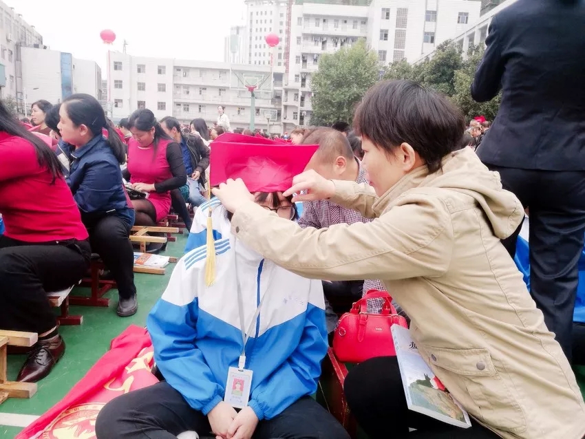 飽含著家長對孩子的摯愛家長親自給孩子戴上成人帽