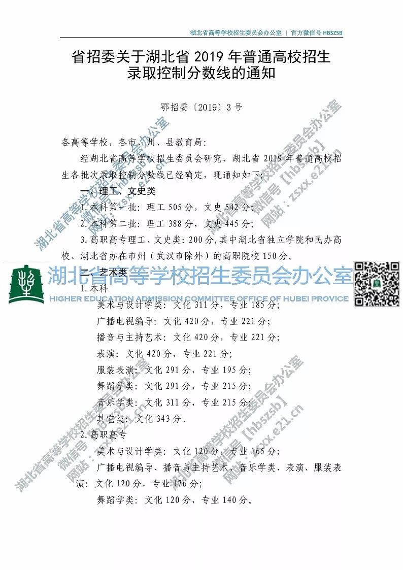 湖北省2019年普通高校招生錄取控制分?jǐn)?shù)線