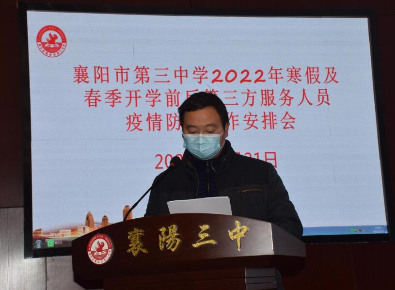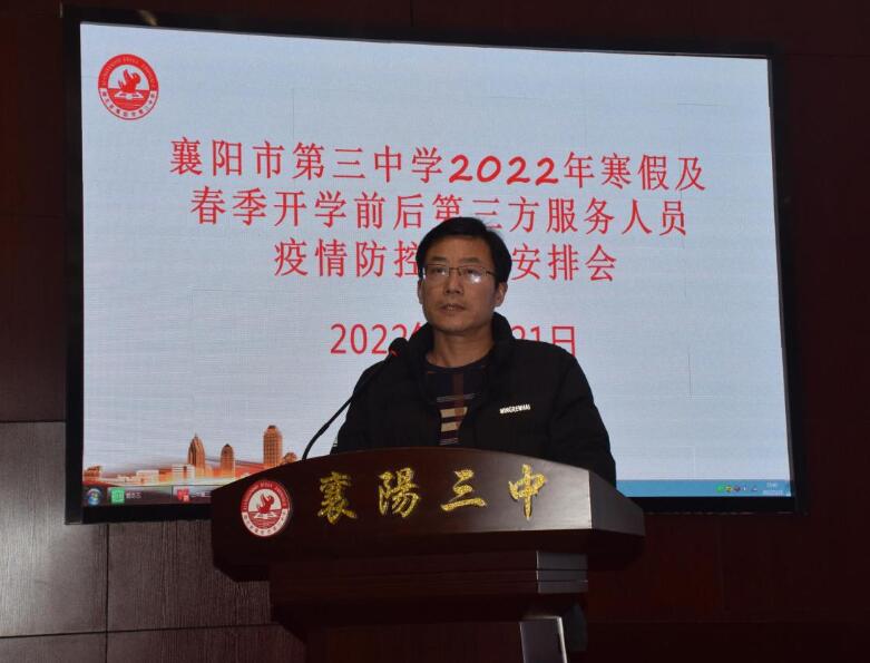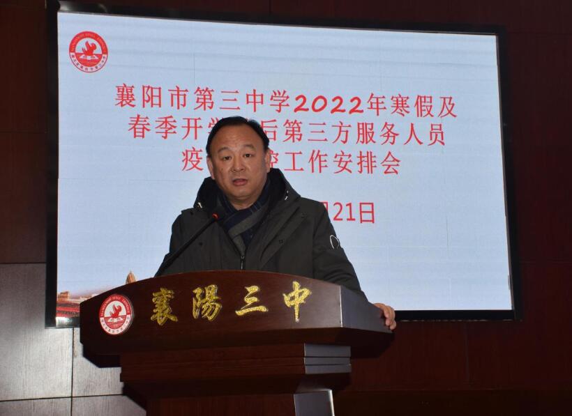 2022年1月21日下午,襄陽三中召集學(xué)校第三方服務(wù)公司全體員工在聞道廳召開2022年寒假及春季開學(xué)前后疫情防控工作安排會,副校長張東出席會議并講話。會議由總務(wù)處楊勝安主任主持。