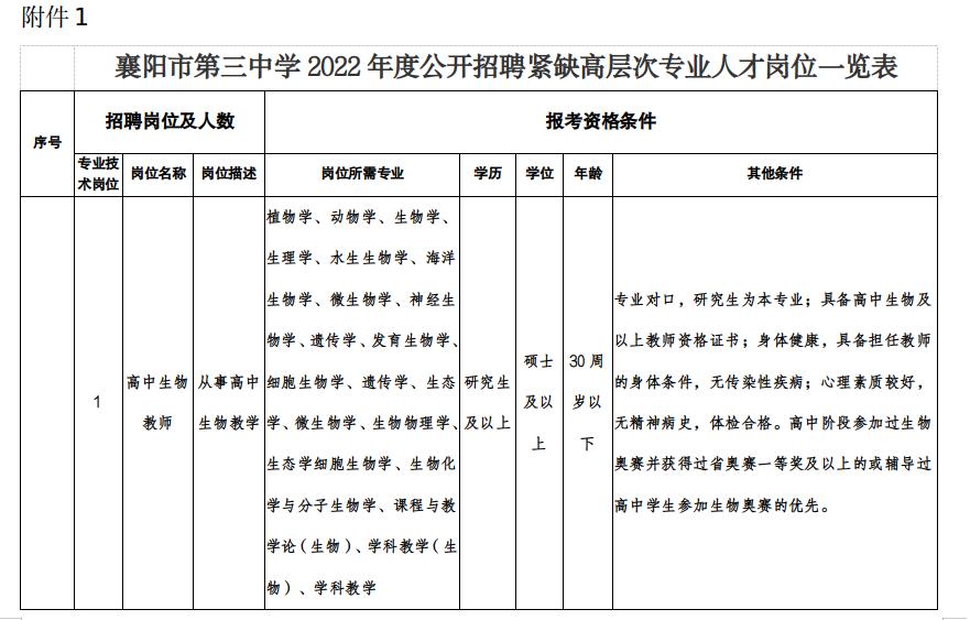 附件:《襄陽(yáng)市第三中學(xué)2022年度公開(kāi)招聘緊缺高層次專業(yè)人才崗位一覽表》